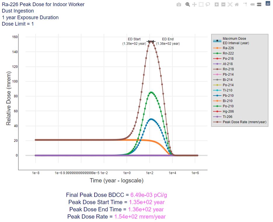 Consider the plot below for Ra-226 default dust ingestion peak BDCC for a indoor worker. The peak dose rate is the maximum sum of the dose contribution from all chain members for a year. To calculate the dose contribution of the chain members, determine the activity by decaying the parent and ingrowing progeny for all time using a Bateman equation decay solver. The Bateman equation describes the abundances and activities of all members of the decay chain as a function of time, based on the decay rates and initial abundances. Beginning with one unit activity for the parent (e.g., 1 pCi), the fractional activity relationship of the progeny to the parent is determined as a function of time. Once the activity over time is known for all chain members, it is converted to an annual dose using the toxicity values and exposure parameters of the land use chosen by the user for each exposure route. See the equation below. The activities determined by the Bateman equation have been converted to an annual dose (mrem) as seen in the plot. The largest dose peak is identified as the peak annual dose (mrem).